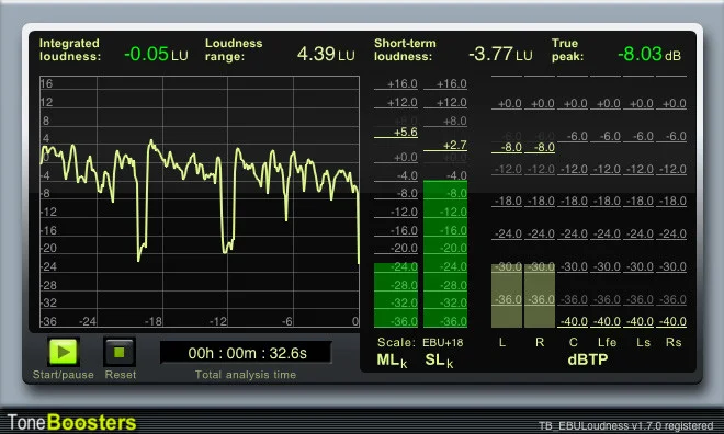 OK, so that’s what we have to aim for, how do we measure that? Luckily many mastering programs now have a tool or plugin that is R128-compatible, for example PreSonus Studio One Pro (from version 3.5). If your software has such a built-in tool, use it! If not, there are several plugins you can choose from. My favourite is TB EBULoudness from ToneBoosters which is very inexpensive, but other free alternatives include dpMeter from TB Pro Audio, MLoudness Analyzer from Melda, and Steinberg’s SLM 128. Once you have installed that, make sure any mixes you master for final release fit into the levels shown above. If in doubt, if you are doing music aim for a target level of -16 LUFS and you should be fine.